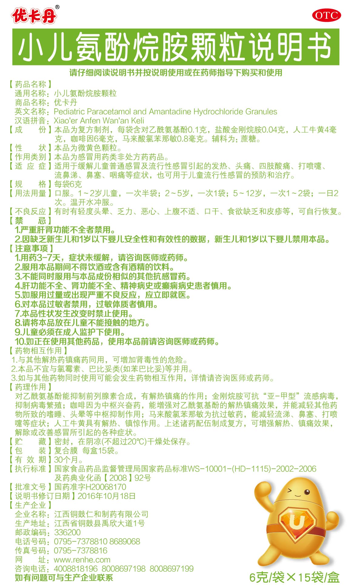 【成份】本品為復方制劑,每袋含對乙酰氨基酚0.1克,鹽酸金剛烷胺0.04克,人工牛黃4毫克,咖啡因6毫克,馬來酸氯苯那敏0.8毫克。輔料為:蔗糖。
